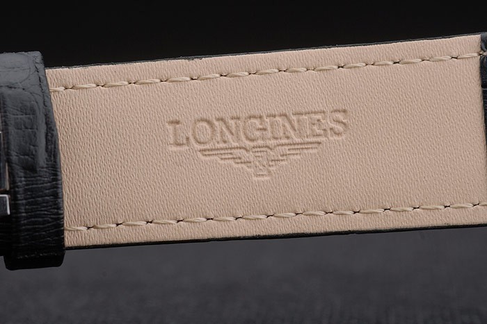 Bracelet: Longines heat embossed black crocodile leather strap with Longines logo inscribed and polished stainless steel hook clasp