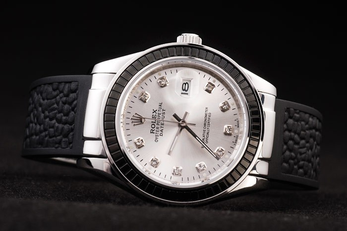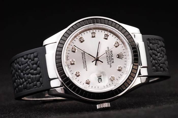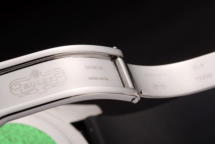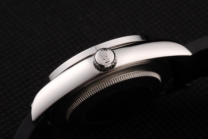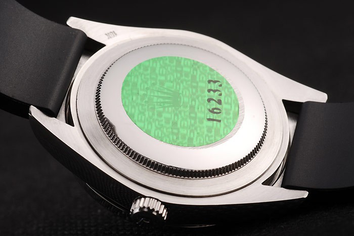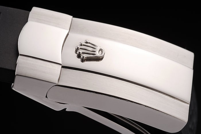 Bracelet: Designed black rubber strap with Rolex engraved fold-in clasp with Rolex logo carved on top