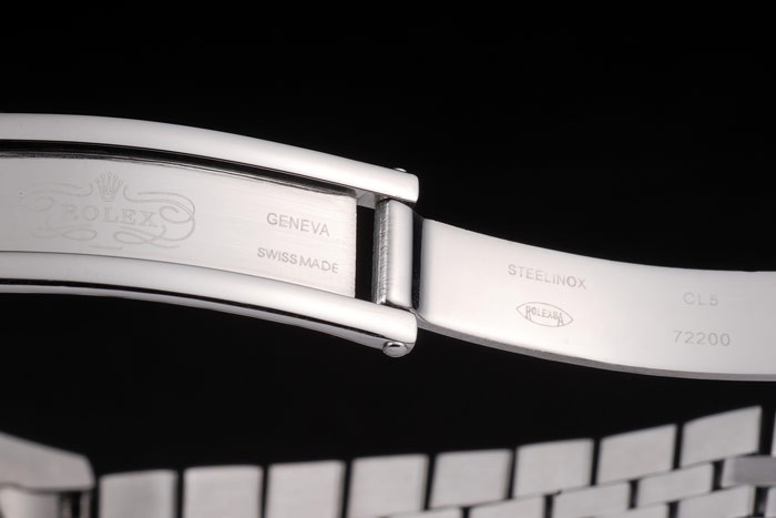 Bracelet: Brushed stainless steel link bracelet with Rolex engraved hidden clasp displaying the Rolex logo