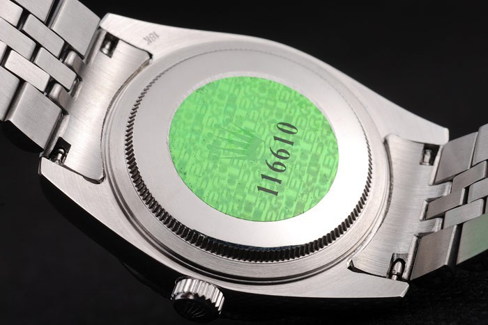 Back: Stainless steel push-in case back with green Rolex logo stamp