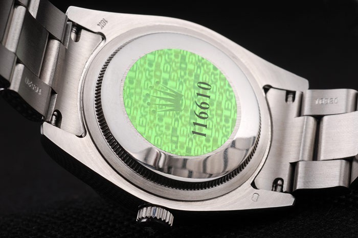 Back: Stainless steel push-in case back with green Rolex logo stamp
