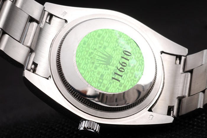 Back: Stainless steel push-in case back with green Rolex logo stamp