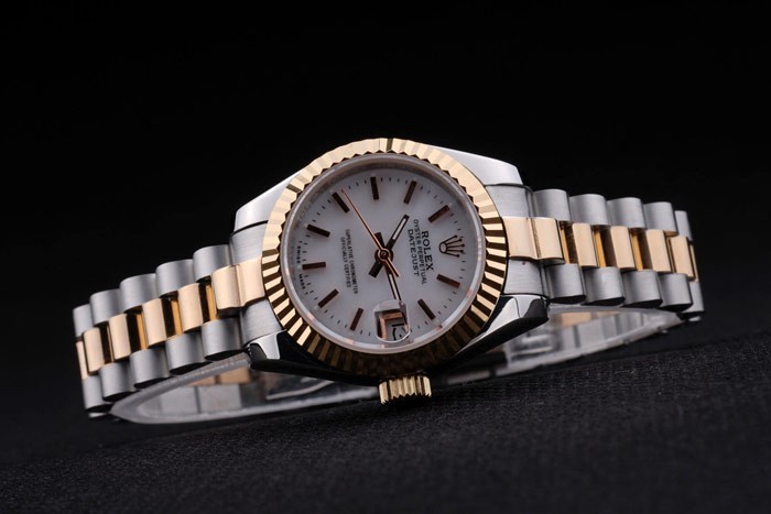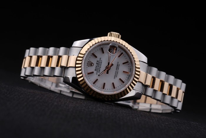 Bracelet: Two toned triple link bracelet in polished stainless steel and 18k yellow gold plated steel with Rolex engraving fold -in deployment clasp displaying the Rolex logo