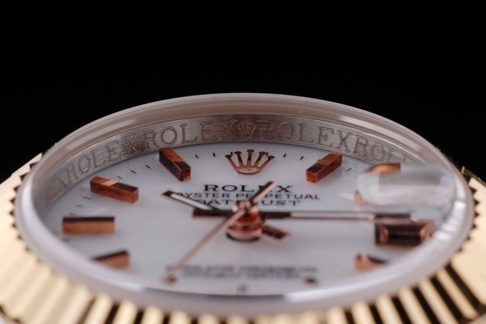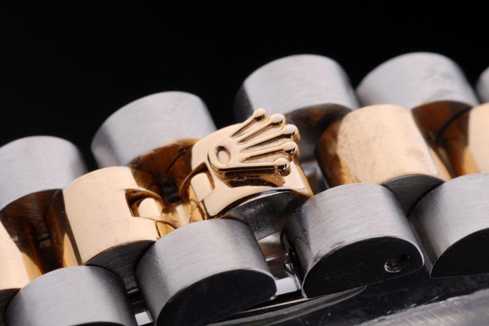 Crown: 18k yellow gold plated steel cutwork crown with Rolex logo