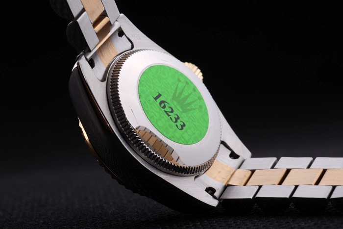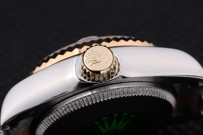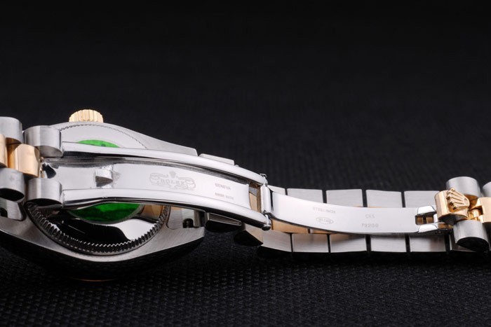 Back: Stainless steel push-in case back with green Rolex logo stamp