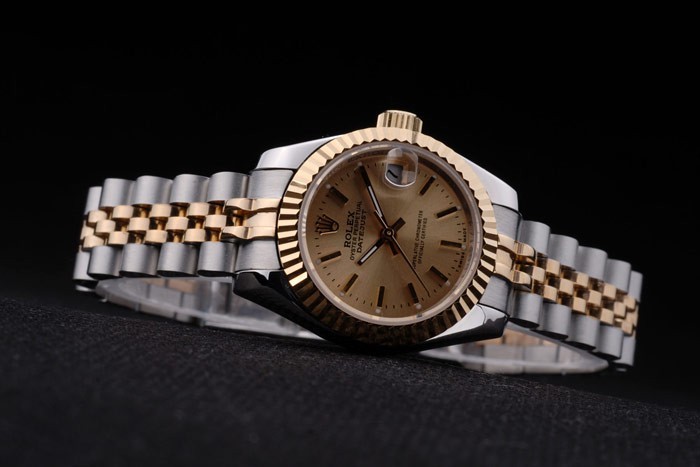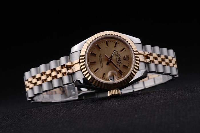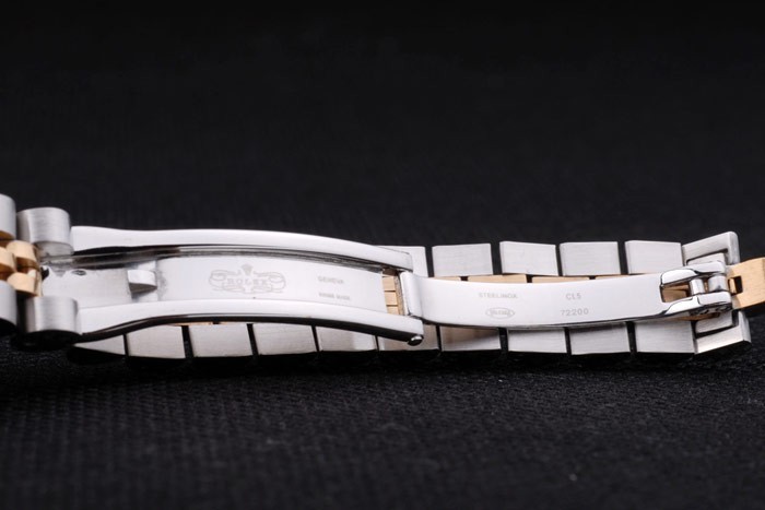 Bracelet: Two toned link bracelet in polished stainless steel and 18k yellow gold plated steel with Rolex engraving hidden clasp displaying the Rolex logo
