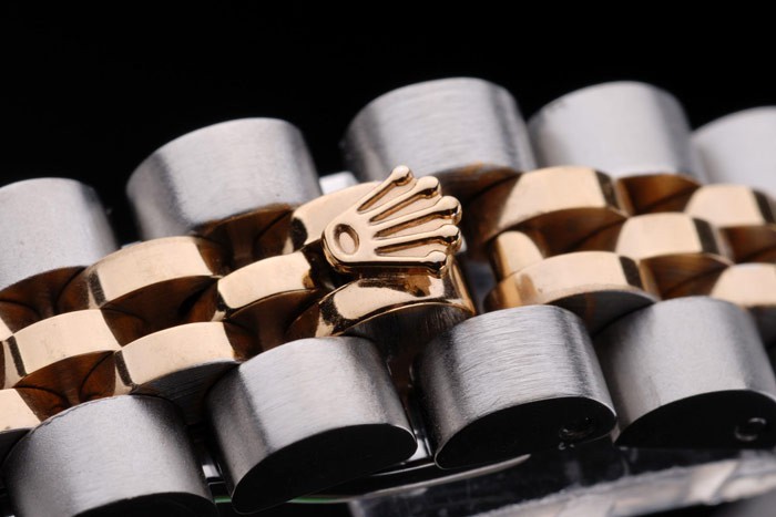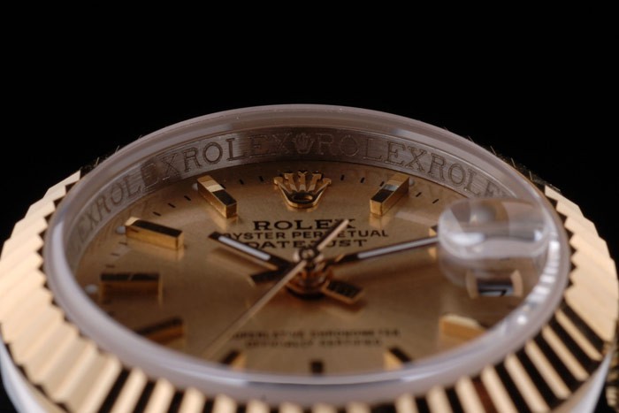 Crown: 18k yellow gold plated steel cutwork crown with Rolex logo