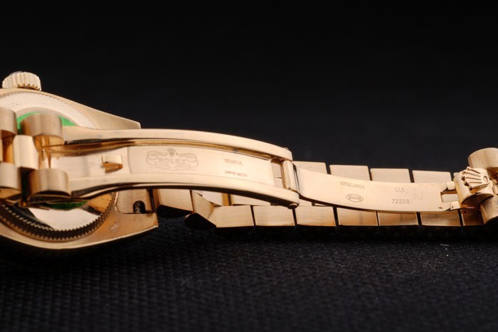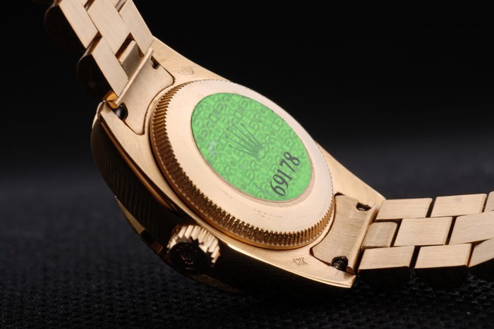 Back: 18k yellow gold plated stainless steel push-in case back with green Rolex logo stamp