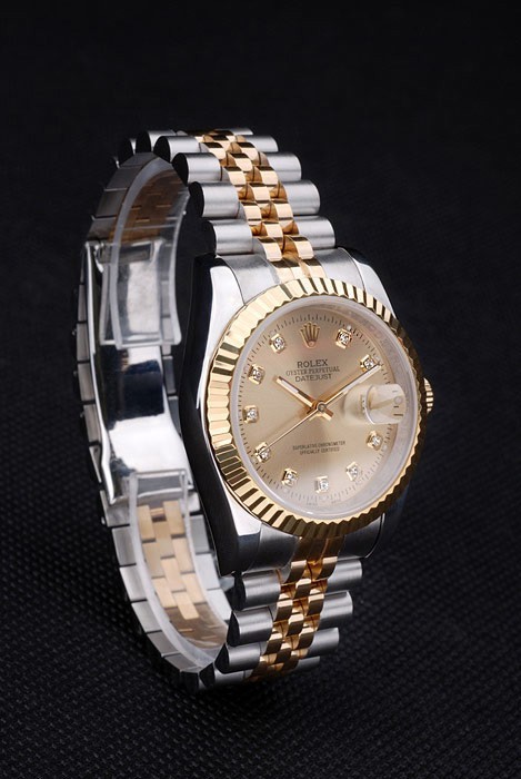 Bracelet: Two toned link bracelet in polished stainless steel and 18k yellow gold plated steel with Rolex engraving hidden clasp displaying the Rolex logo