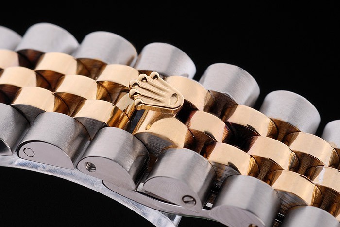 Bracelet: Two toned link bracelet in brushed stainless steel and 18k yellow gold plated steel with Rolex engraving hidden clasp displaying the Rolex logo