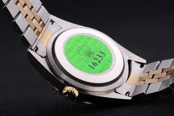 Back: Stainless steel push-in case back with green Rolex logo stamp