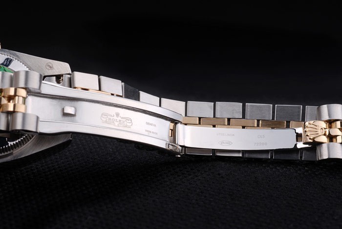 Bracelet: Two toned link bracelet in brushed stainless steel and 18k yellow gold plated steel with Rolex engraving hidden clasp displaying the Rolex logo