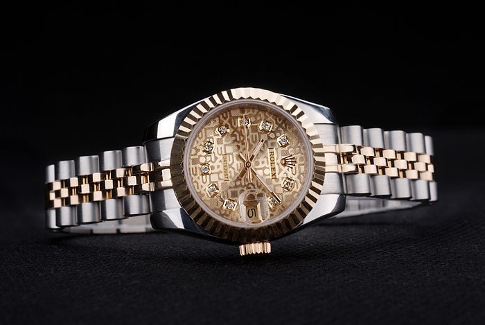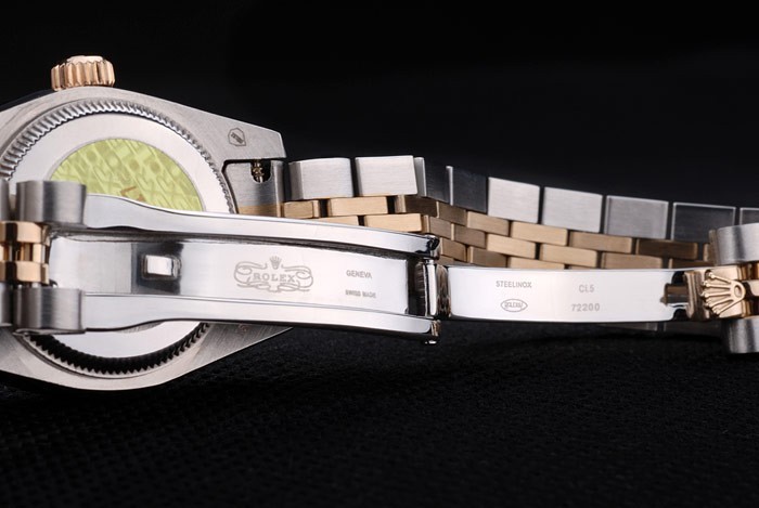 Bracelet: Two toned link bracelet in brushed stainless steel and 18k yellow gold plated steel with Rolex engraving hidden clasp displaying the Rolex logo