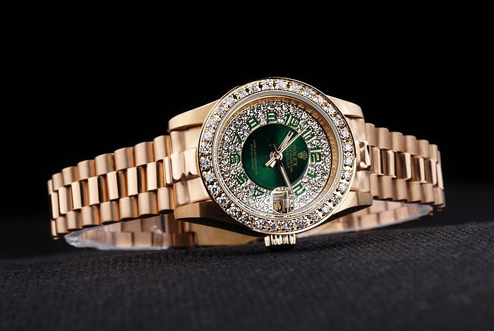 Back: 18k yellow gold plated stainless steel push-in case back with green Rolex logo stamp