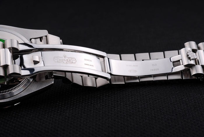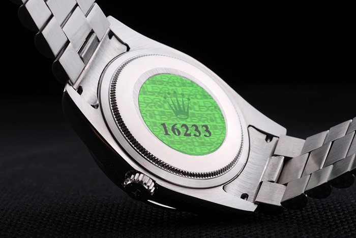 Back: Stainless steel push-in case back with green Rolex logo stamp