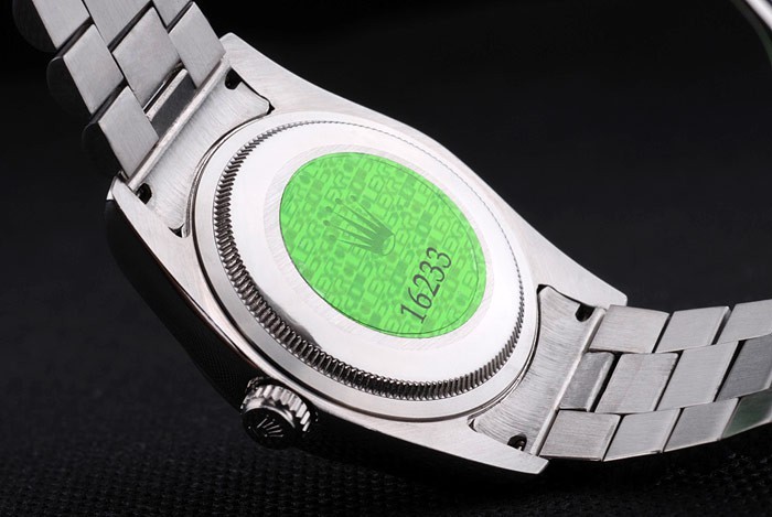 Back: Stainless steel push-in case back with green Rolex logo stamp