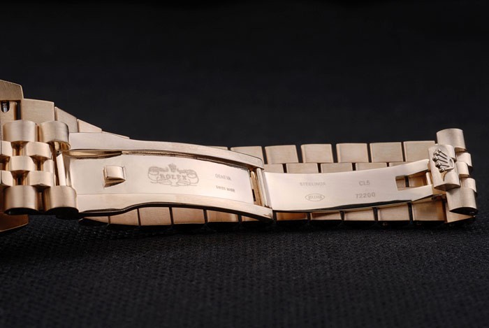 Back: 18k yellow gold plated stainless steel push-in case back with green Rolex logo stamp