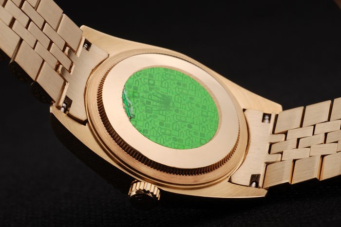 Back: Push back in 18K yellow gold with green Rolex sticker and markings