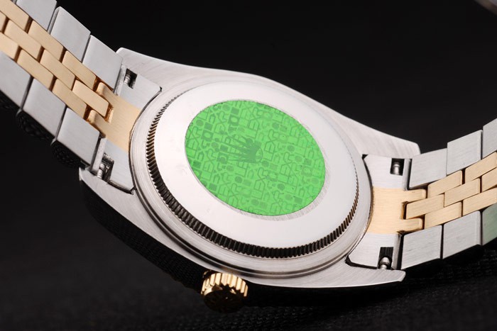 Back: Push in stainless steel back with green Rolex sticker and markings