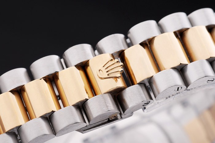 Bracelet: Brushed stainless steel and yellow gold link chain with fold over clasp and Rolex crown engraving