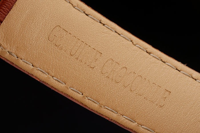 Bracelet: Rolex heat embossed brown crocodile leather strap with engraved rose-gold deployment clasp with Rolex logo on top