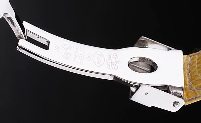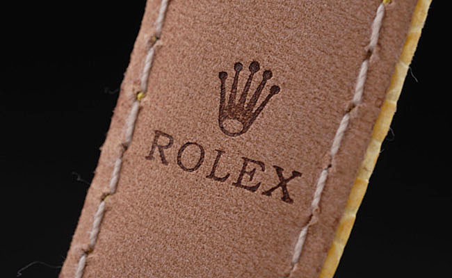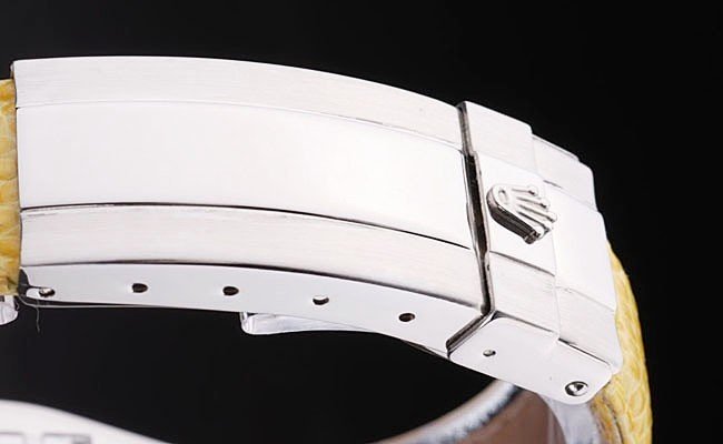 Bracelet: Yellow snake leather strap with Rolex and logo engraving and stainless steel deployment clasp displaying Rolex logo