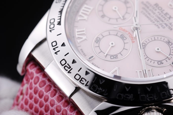 Bracelet: Pink snake leather strap with Rolex and logo engraving and stainless steel deployment clasp displaying Rolex logo