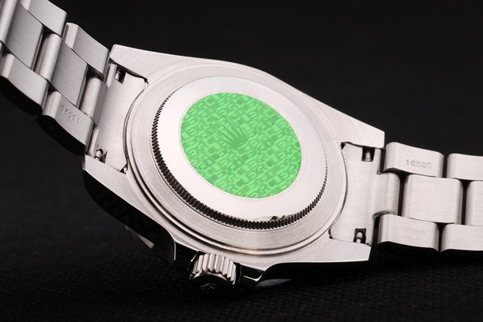 Back: Push in stainless steel back with green Rolex sticker and markings