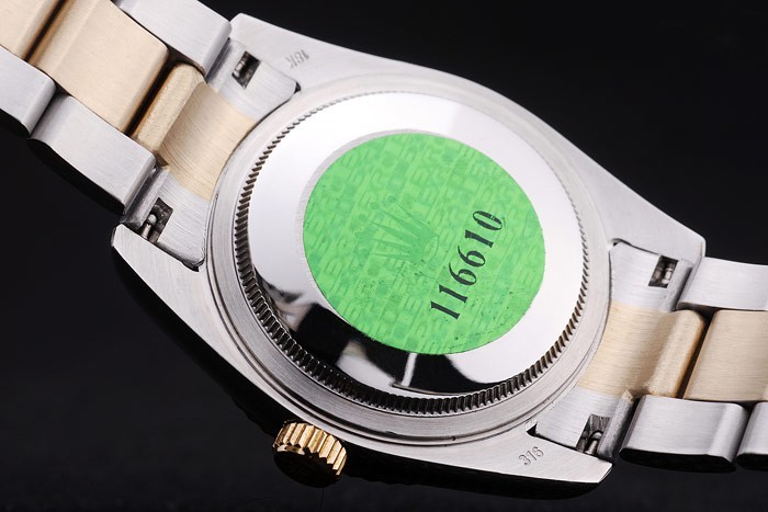 Back: Stainless steel snap-in back with green Rolex authenticity sticker