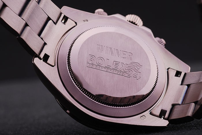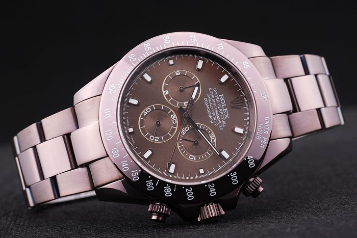 Back: Rosy brown powder coated brushed stainless steel snap-in back with Rolex inscription