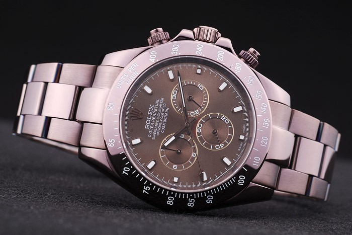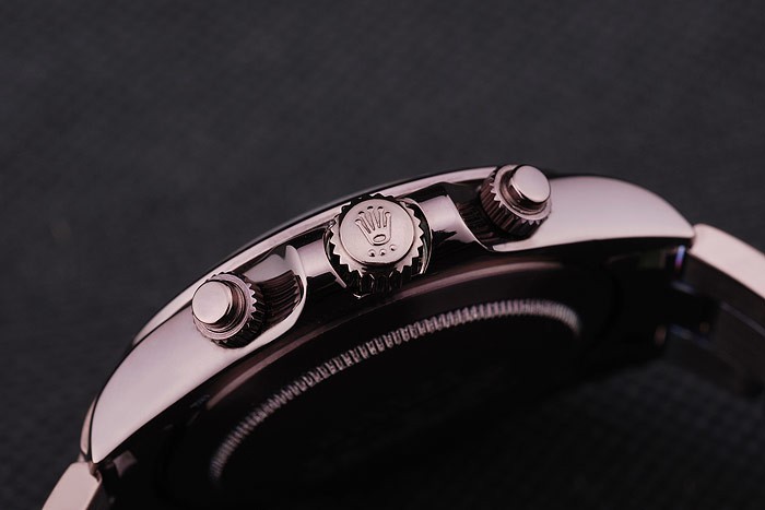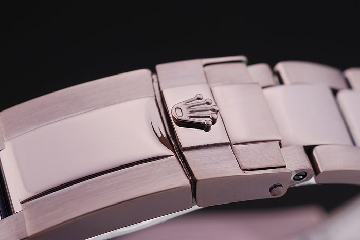 Crown: Rosy brown stainless steel cutwork crown with Rolex logo and two smaller push-button cutwork crowns on either side of it