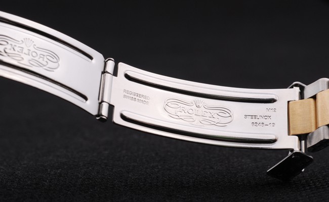 Bracelet: Two toned brushed and gold tone stainless steel link bracelet with Rolex engraving fold in clasp displaying the Rolex logo