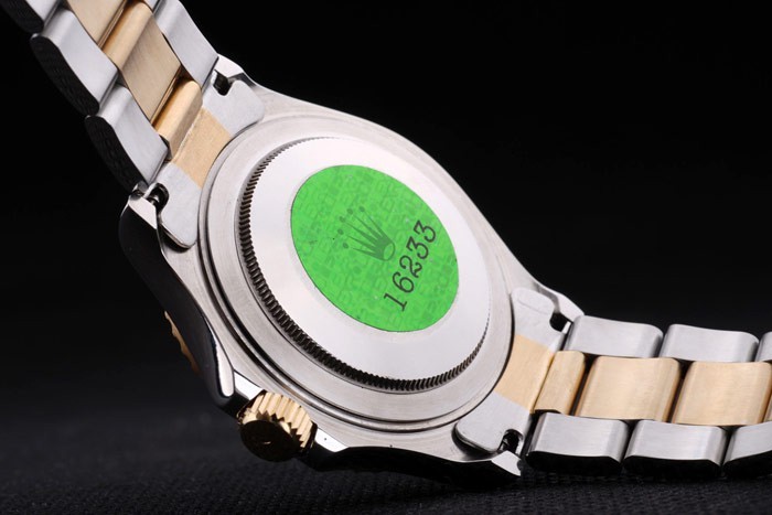 Back: Stainless steel push-in case back with green Rolex engraving stamp
